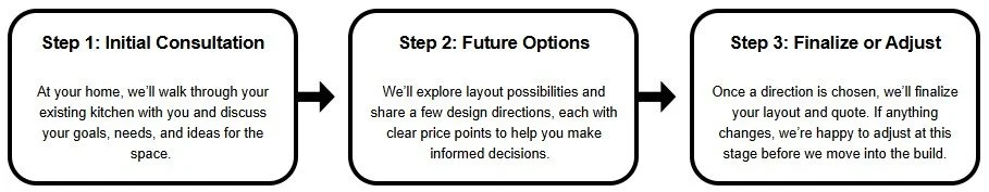 We keep things clear, collaborative, and focused on what matters most—your space, your style, and how you actually use your kitchen. From the first walkthrough to layout sketches and finish planning, we work together to map out a design that makes sense for your goals. The result: a straightforward, well-thought-out plan that flows directly into your project with us—no handoff, no confusion.